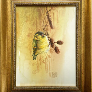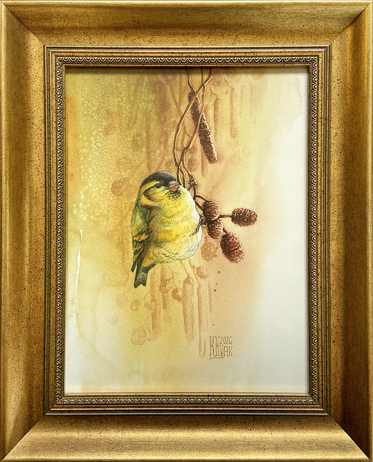 Marcowa kompozycja z czyżykiem w ciepłych i ziemistych kolorach przedwiośnia. Samiec czyżyka posila się nasionami z orzeczków olszy czarnej. Akwarela oprawiona została w klimatycznej pracowni u lokalnego ramiarza w złotą ramę z litego drewna o rozbudowanym profilu. Mimo okazałej ramy nie przytłacza ona delikatnej akwareli. Obraz pięknie wpisze się w klasyczne wnętrze z ciepłymi i naturalymi kolorami.