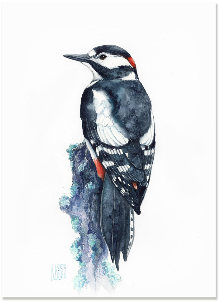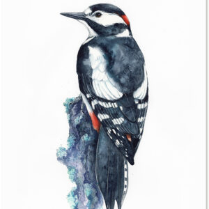 Obraz oryginalny w technice akwareli przedstawiający dzięcioła dużego.