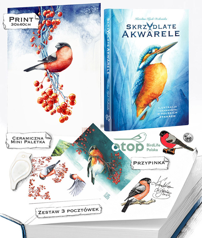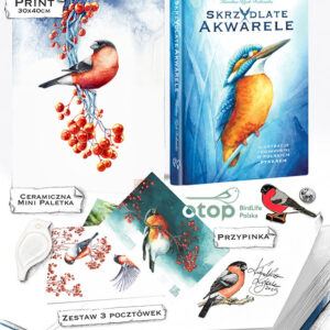 Okazjonalny, limitowany (25 sztuk) zestaw książki „Skrzydlate Akwarele” z ilustracjami i ciekawostkami o polskich ptakach. W zestawie „Jarzębinowy gil” na pierwszej stronie książki znajdziesz kolorowy rysowany autograf z gilem. W uwagach do zamówienia możesz zażyczyć sobie dedykację i/lub wybrać gatunek ptaka jako kolorowy rysunek (w przypadku braku uwag rysuję kolorowego gila). Dodatkowo otrzymasz print z tym ptakiem kojarzonym z zimą w formacie 30x40cm. Print wydrukowany w wysokiej jakości na papierze akwarelowym, podpisany i numerowany przez autorkę. Do zestawu dołączam również 3 okazjonalne pocztówki będące reprodukcjami akwarel jakie znajdziesz w książce, przypinkę otop i ceramiczną paletką do akwareli w kształcie gila.