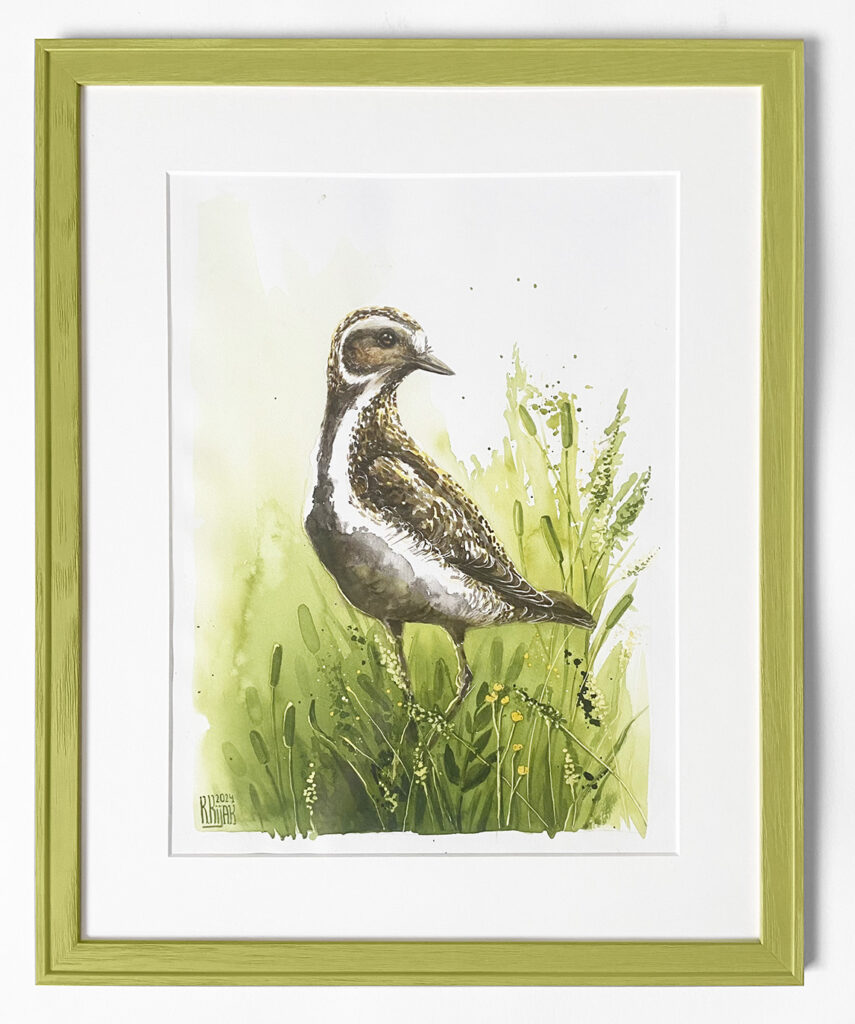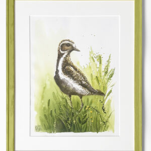 Akwarela w łąkowym klimacie z mieszkanką trawiastych obszarów: siewką złotą. Obraz oprawiony w drewnianą ramę pociągniętą pięknym, jasnym odcieniem zieleni.
