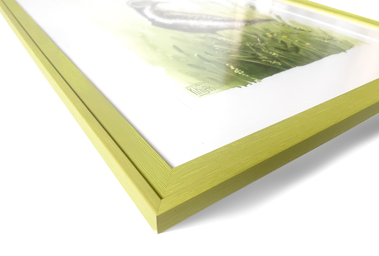 Oprawa: Rama drewniana w jasnozielonym kolorze, białe passepartout, z przodu szyba.