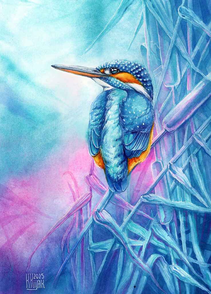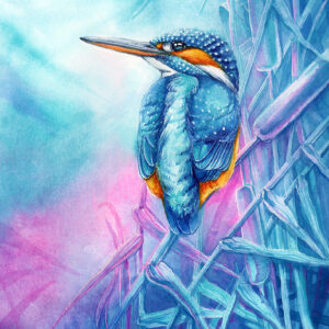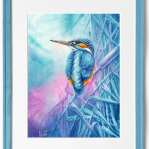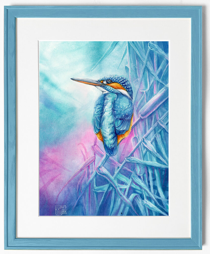 Zimorodek w błękitnych i turkusowych kolorach, które przełamuję fioletem i różem. Obraz na papierze akwarelowym, oprawiony w drewnianą ramę w równie błękitnym co obraz kolorze i białe passepartout, dzięki czemu zachowuje spójność i elegancję.  Obraz gotowy do powieszenia na ścianie.