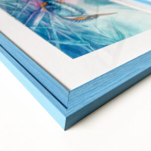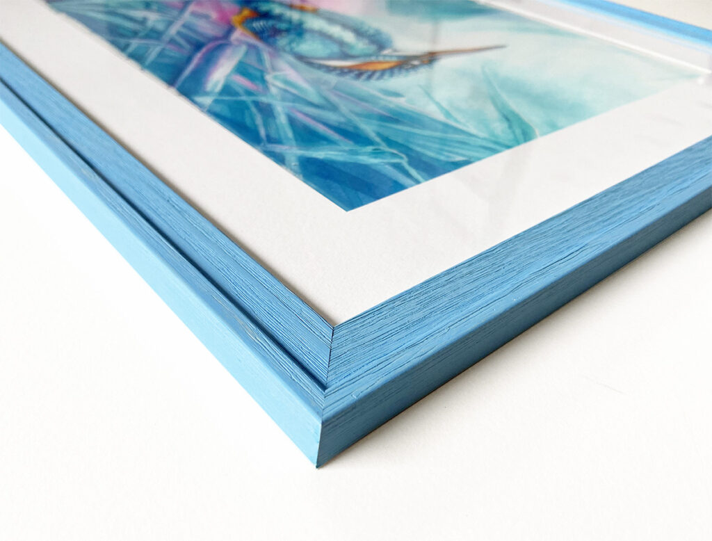 Oprawa: Rama drewniana w błękitnym kolorze, białe passepartout, z przodu szyba.