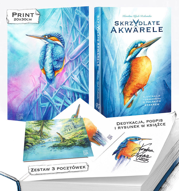 Okazjonalny, limitowany (25 sztuk) zestaw książki „Skrzydlate Akwarele” z ilustracjami i ciekawostkami o polskich ptakach. W zestawie „Zimorodkowy błękit” na pierwszej stronie książki znajdziesz kolorowy rysowany autograf z zimorodkiem. W uwagach do zamówienia możesz zażyczyć sobie dedykację i/lub wybrać gatunek ptaka jako kolorowy rysunek. Dodatkowo otrzymasz print z błękitnym ptakiem polskich wód w formacie 20x30cm. Print wydrukowany w wysokiej jakości na papierze akwarelowym, podpisany i numerowany przez autorkę. Do zestawu dołączam również 3 okazjonalne pocztówki będące reprodukcjami akwarel jakie znajdziesz w książce.