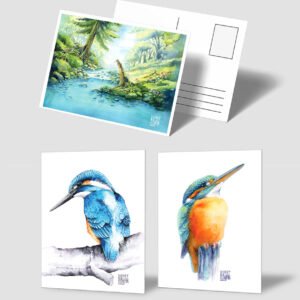 Zestaw trzech drukowanych pocztówek z reprodukcjami moich akwareli, przedstawiających dwa portrety z zimorodkiem oraz krajobraz z książki „Skrzydlate akwarele”. Pocztówki w formacie A6 z uszlachetnionym wykończeniem. Można je wysłać, oprawić lub po prostu zatrzymać dla siebie jako przypomnienie by wyjść na spacer i poobserwować ptaki