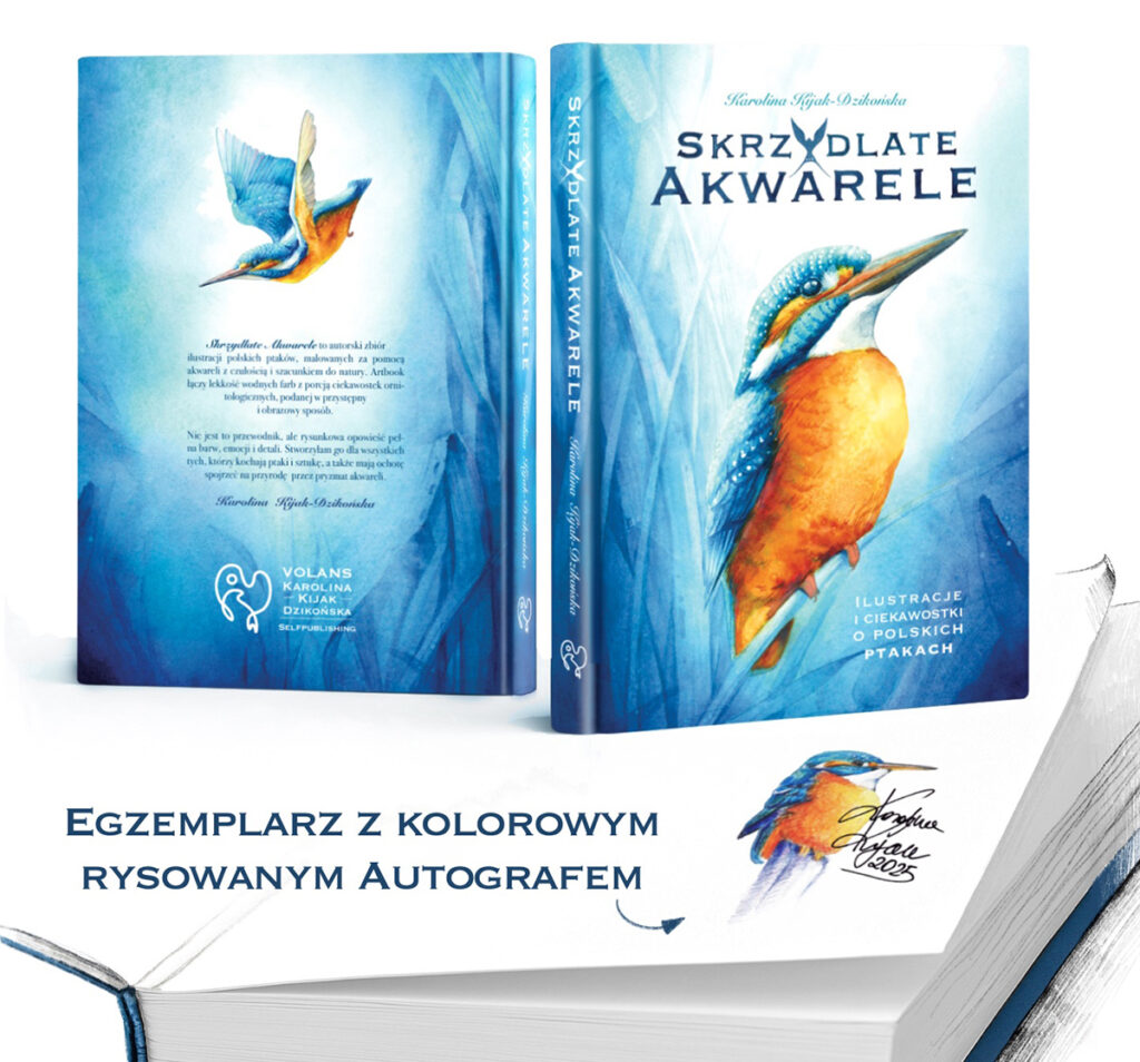 Książka Skrzydlate akwarele egzemplarz z kolorowym rysowanym autografem autorki. Na życzenie napiszę Ci dedykację lub narysuję w książce inny gatunek ptaka niż zimorodek. Teksty i życzenia proszę wpisywać w polu „Uwagi” w koszyku. Można też napisać do mnie mail na adres: kontakt@skrzydlateakwarele.pl