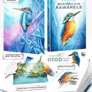 Okazjonalny, limitowany (25 sztuk) zestaw książki „Skrzydlate Akwarele” z ilustracjami i ciekawostkami o polskich ptakach. W zestawie „Zimorodkowy błękit” na pierwszej stronie książki znajdziesz kolorowy rysowany autograf z zimorodkiem. Dodatkowo otrzymasz print z pięknym klejnotem polskich wód w formacie 30x40cm. Print wydrukowany w wysokiej jakości na papierze akwarelowym, podpisany i numerowany przez autorkę. Do zestawu dołączam również 3 okazjonalne pocztówki będące reprodukcjami akwarel jakie znajdziesz w książce, przypinkę otop i ceramiczną paletką do akwareli w kształcie zimorodka.