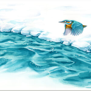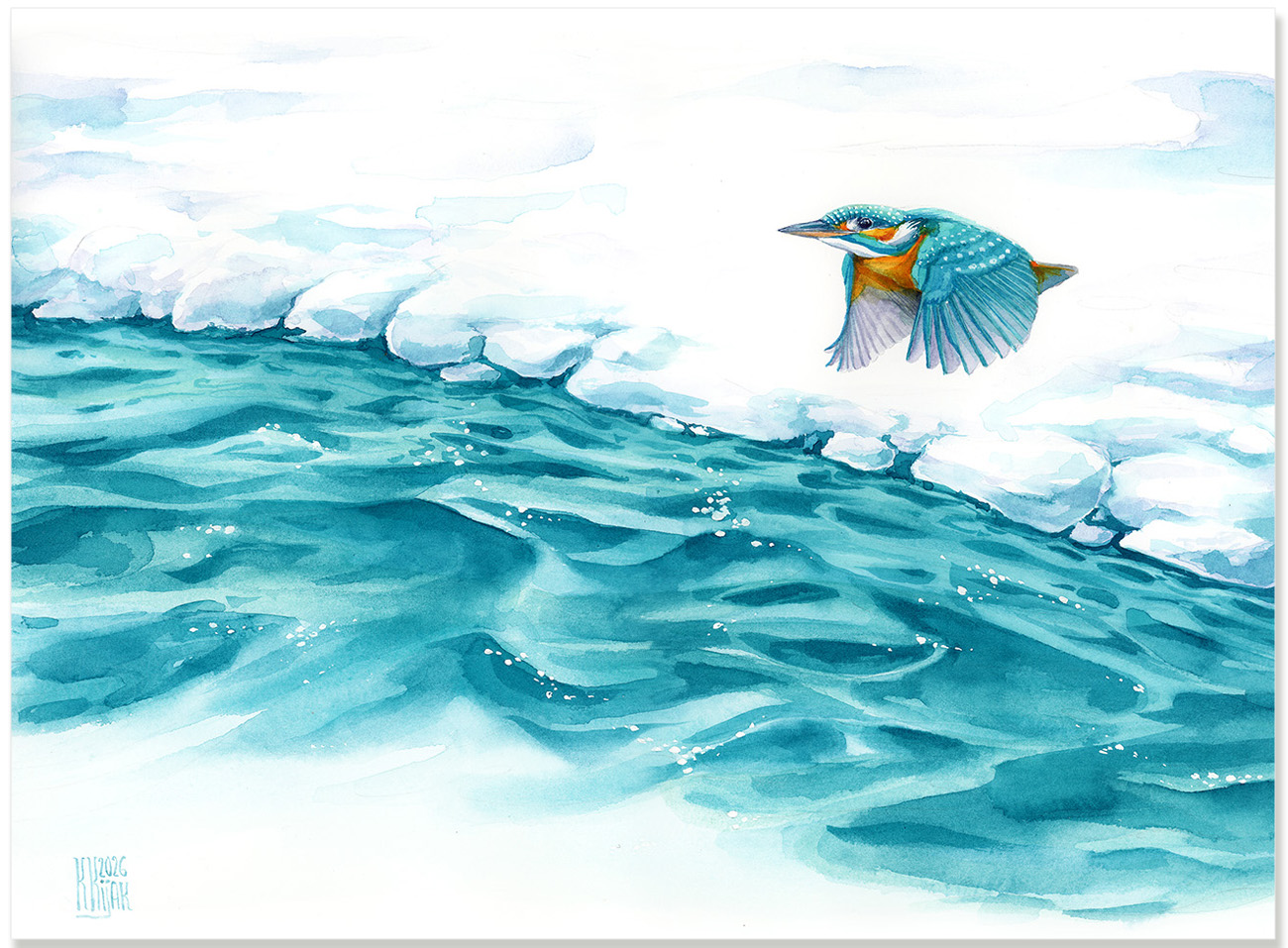 Obraz oryginalny w technice akwareli przedstawiający zimorodka lecącego nad taflą stawu w zimowej scenerii.