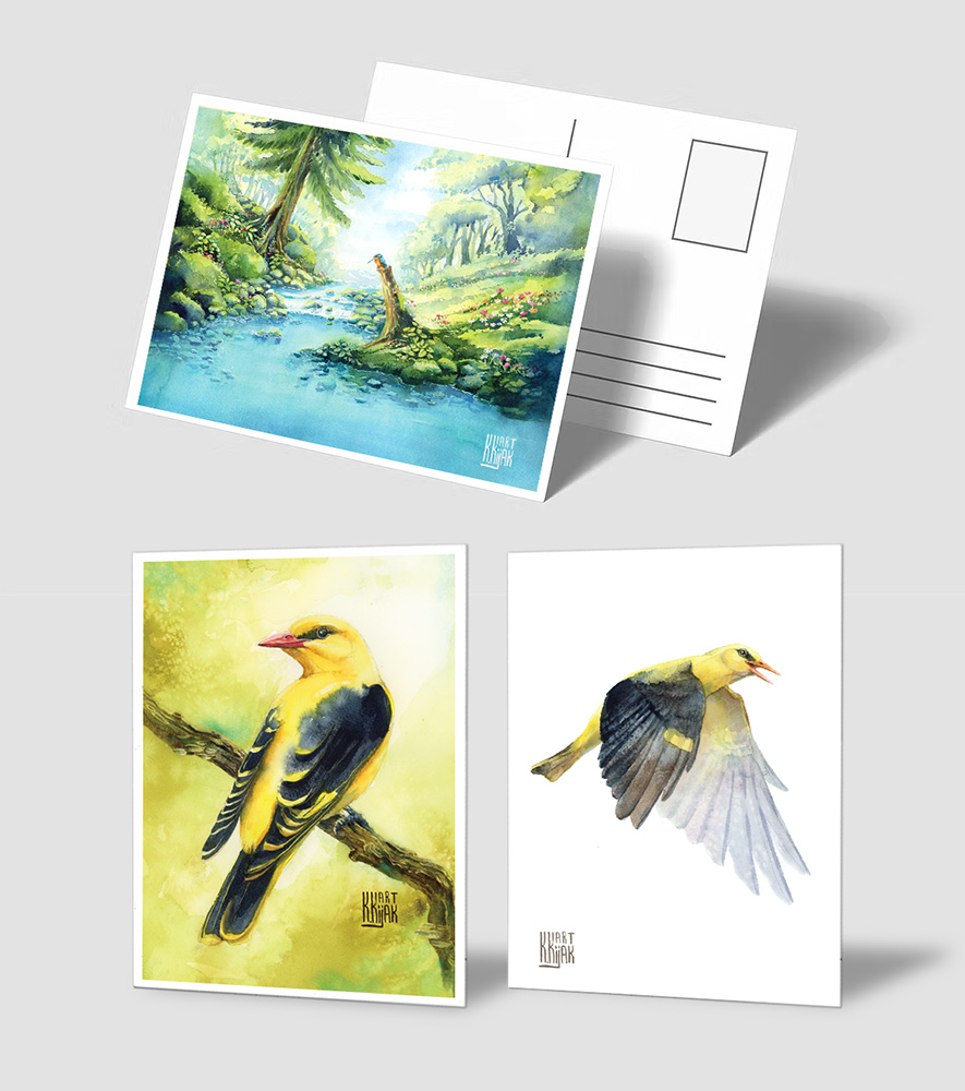 Zestaw trzech drukowanych pocztówek z reprodukcjami moich akwareli, przedstawiających dwa portrety z wilgą oraz krajobraz z książki „Skrzydlate akwarele”. Pocztówki w formacie A6 z uszlachetnionym wykończeniem. Można je wysłać, oprawić lub po prostu zatrzymać dla siebie jako przypomnienie by wyjść na spacer i poobserwować ptaki