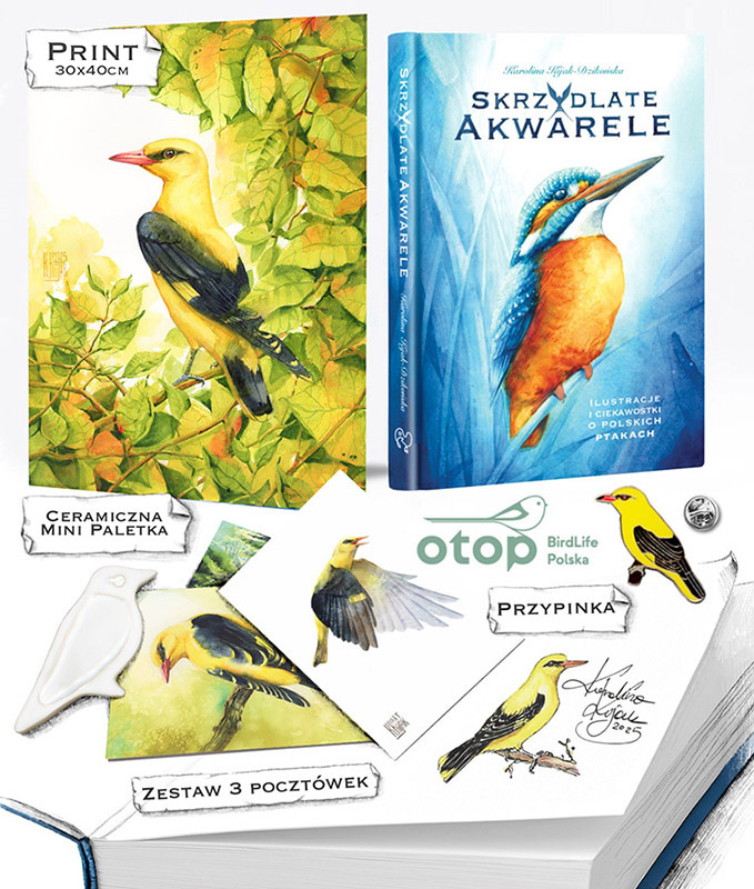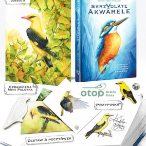 Okazjonalny, limitowany (25 sztuk) zestaw książki „Skrzydlate Akwarele” z ilustracjami i ciekawostkami o polskich ptakach. W zestawie „Złota wilga” na pierwszej stronie książki znajdziesz kolorowy rysowany autograf z wilgą. W uwagach do zamówienia możesz zażyczyć sobie dedykację i/lub wybrać gatunek ptaka jako kolorowy rysunek. Dodatkowo otrzymasz print z tym pięknym złotym ptakiem lata w formacie 30x40cm. Print wydrukowany w wysokiej jakości na papierze akwarelowym, podpisany i numerowany przez autorkę. Do zestawu dołączam również 3 okazjonalne pocztówki będące reprodukcjami akwarel jakie znajdziesz w książce, przypinkę otop i ceramiczną paletką do akwareli w kształcie wilgi.
